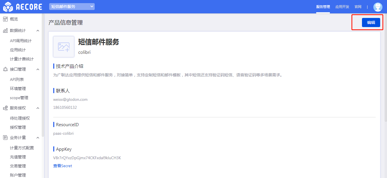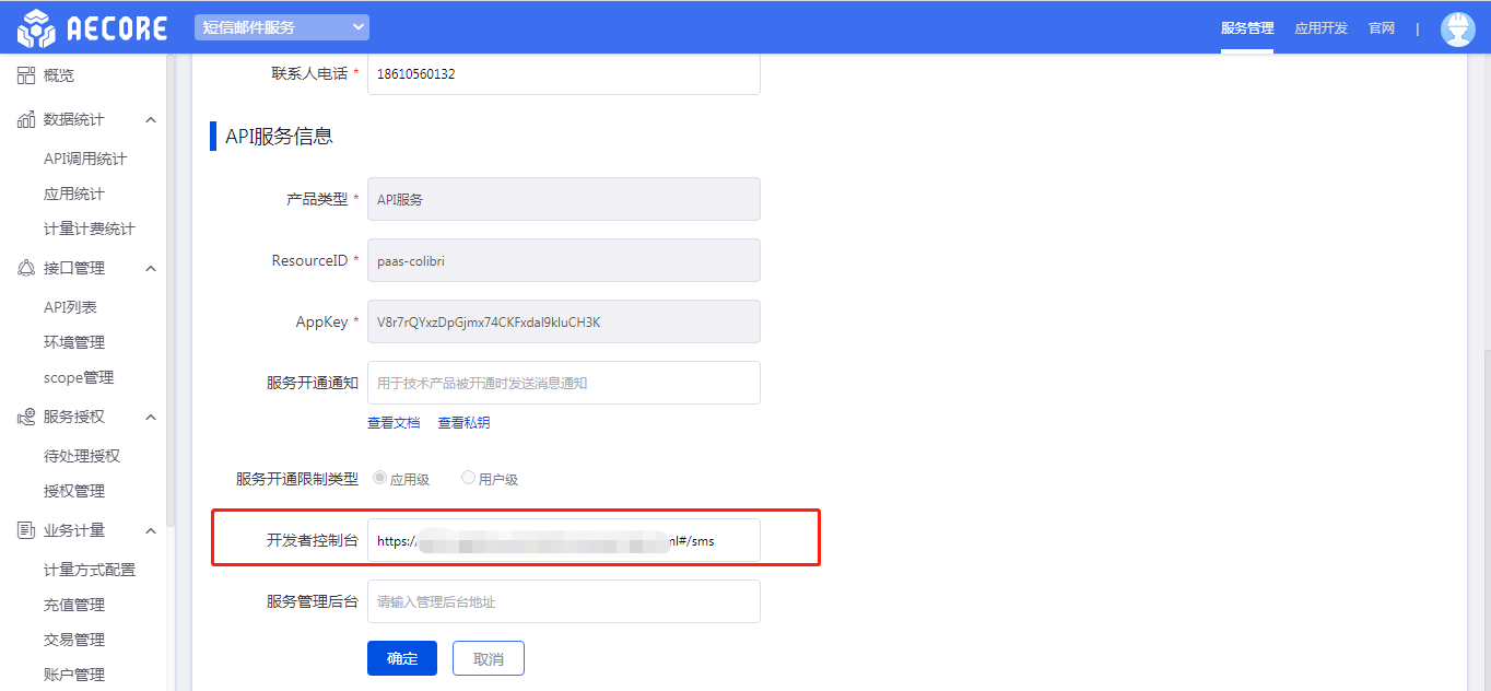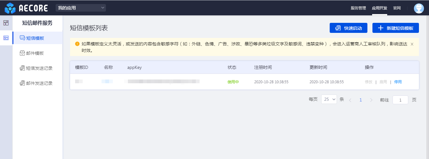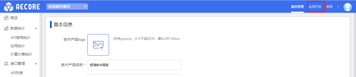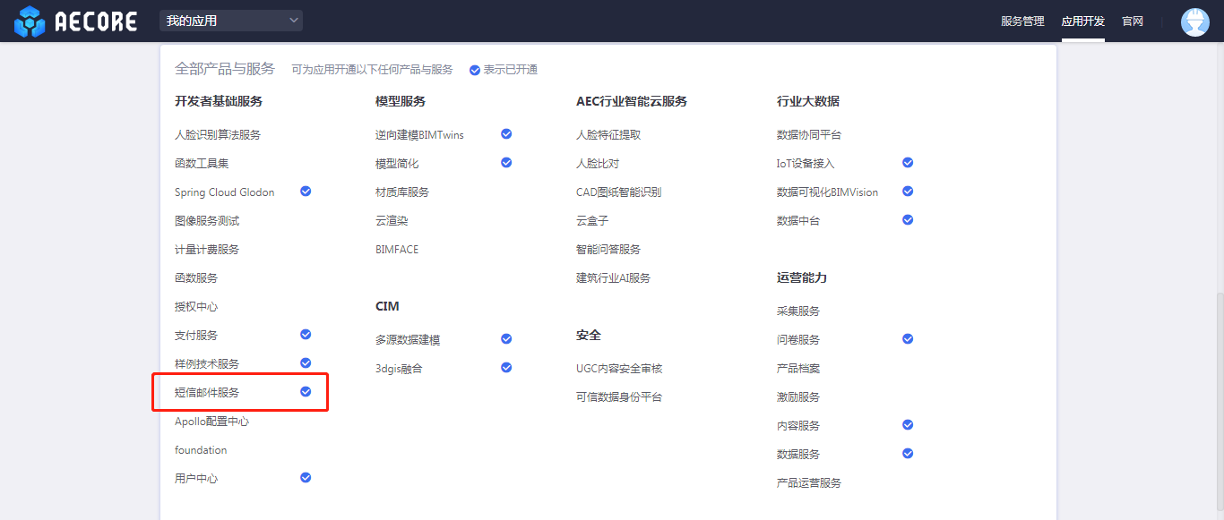 测试路径:进入应用开发—选择任何一个应用—进入应用详情页—开通你的服务即进入控制台(以短息邮件服务为例)