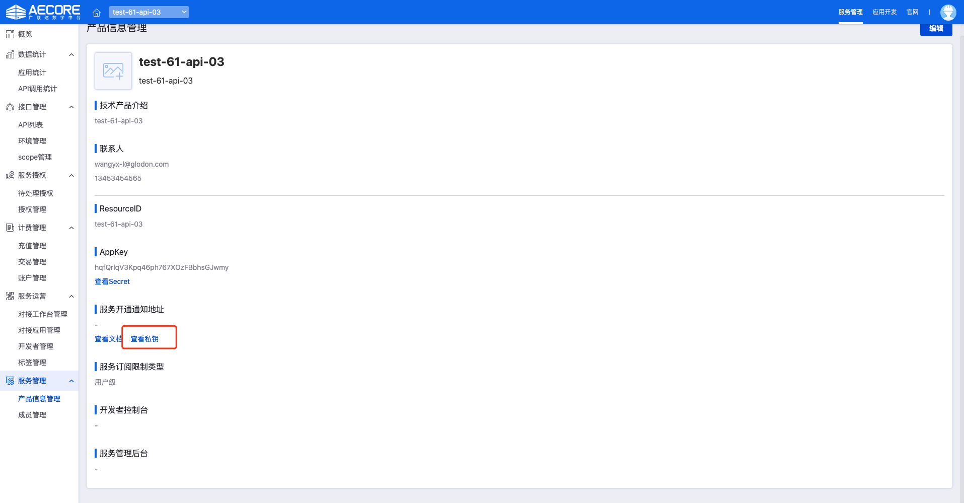 在技术服务中详情中查看密钥