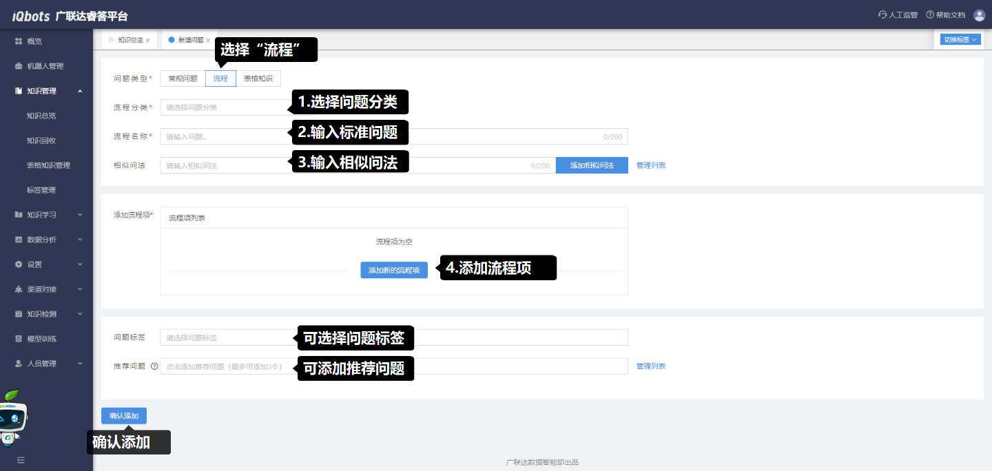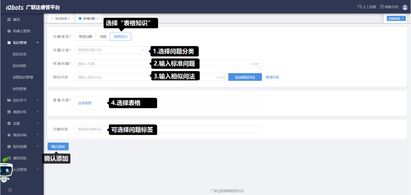 在知识总览页面,可以完成知识分类管理、问题的增删改查、问题的相似问法管理等。