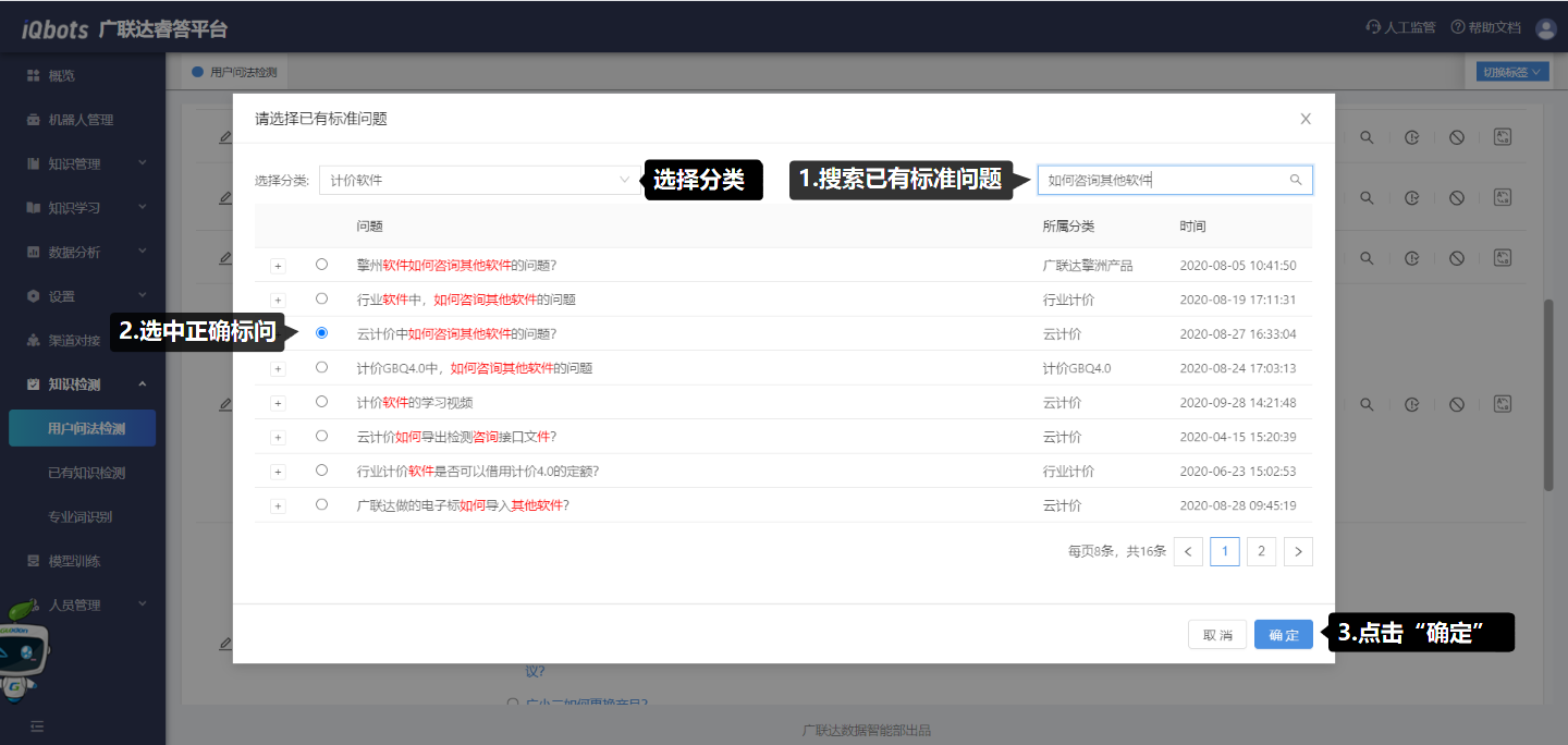 若判断用户问法后的机器人回答不正确,则点击“搜索正确标问”,选择对应的正确回答,该用户问法后的“期待正确回答”会自动同步正确回答;
