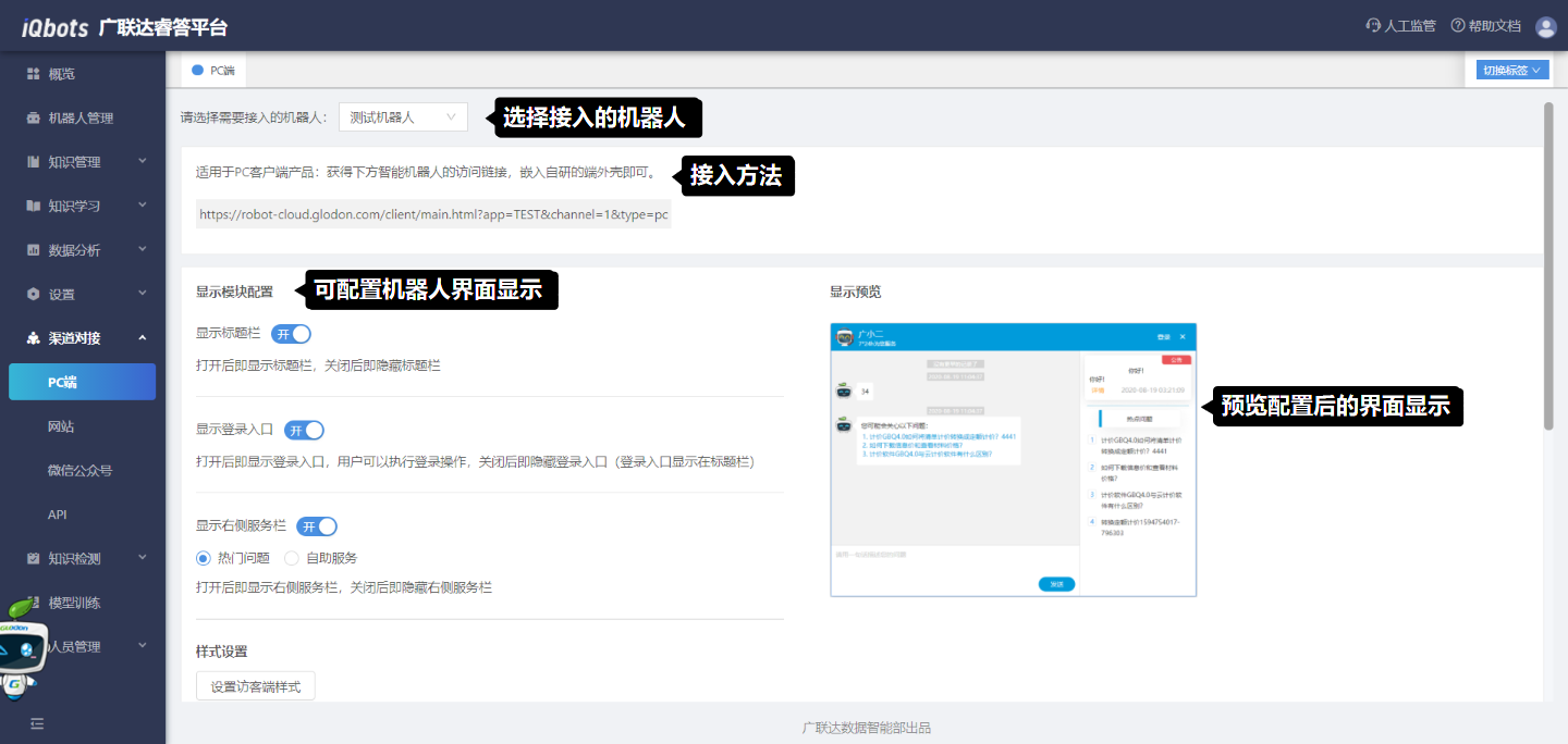 接入步骤:(1)选择需要接入的机器人;(2)将页面中给出的机器人访问链接嵌入自研的端外壳,即可完成机器人的接入。