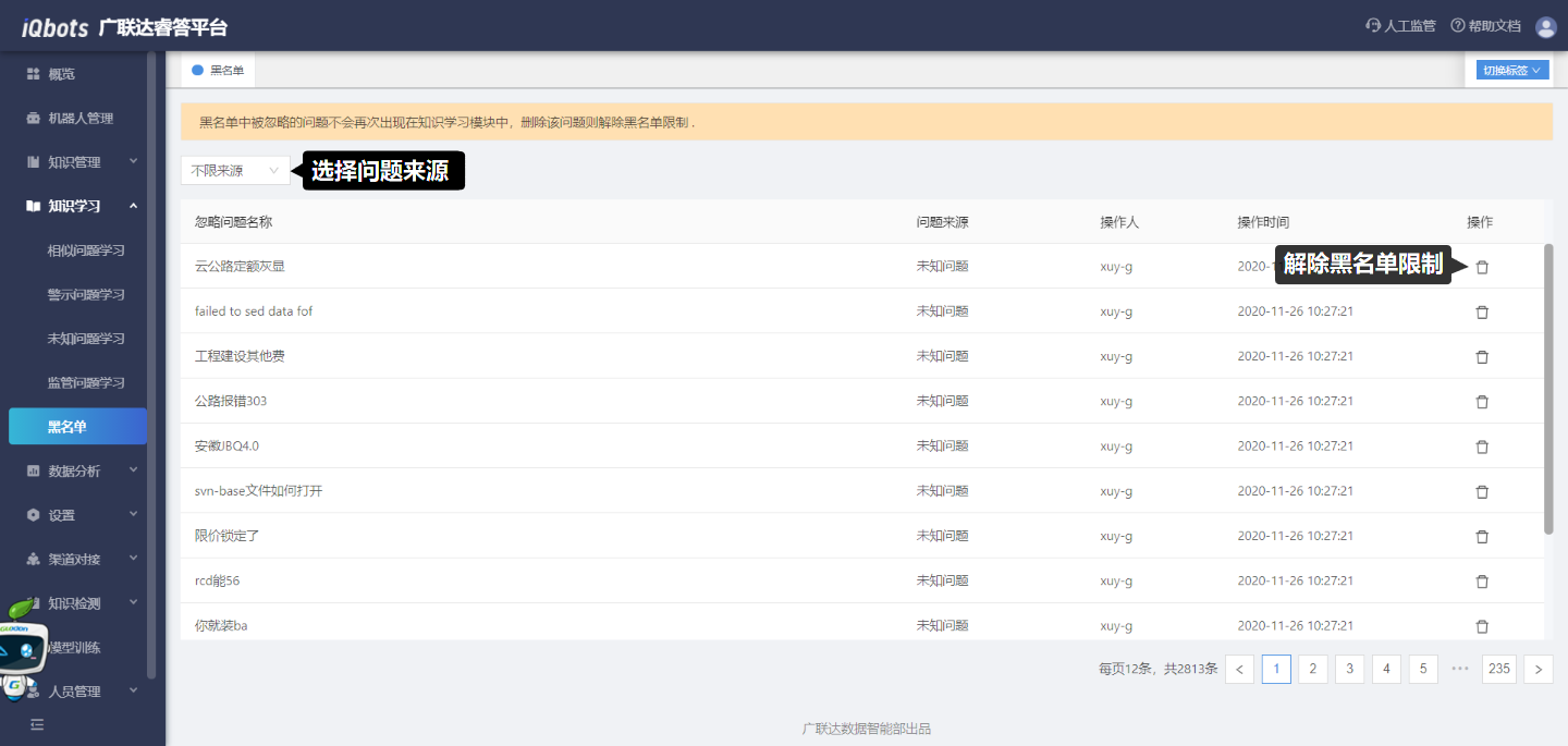 黑名单是指在进行知识学习过程中,不希望无效问题再出现在学习模块,为避免无效工作量而加入黑名单的问题汇总。黑名单中被忽略的问题不会再次出现在知识学习模块中,删除该问题则解除黑名单限制,该问题仍可以加入到其他知识学习模块中。