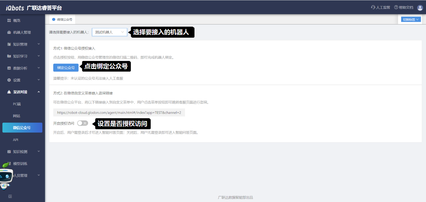 接入步骤:(1)选择需要接入的机器人;(2)选择微信授权或菜单嵌入咨询链接的接入方式,按照页面提示完成接入。