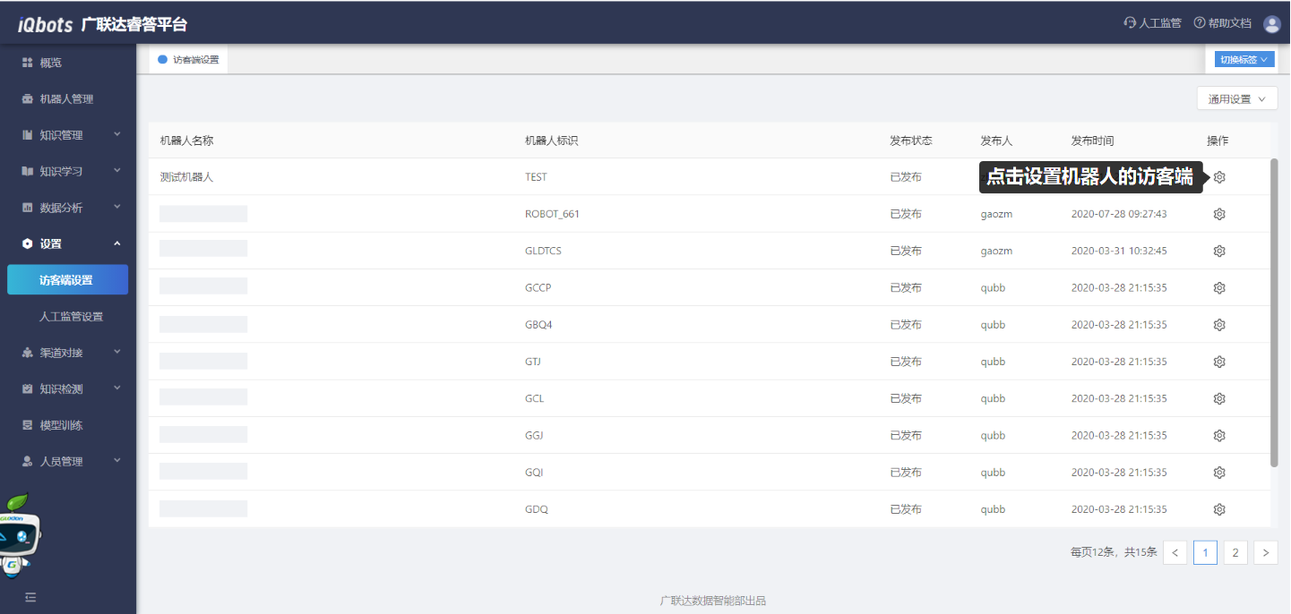 在机器人管理模块中,可以新建机器人、发布机器人、编辑已存在机器人的名称,以及删除建好的机器人。