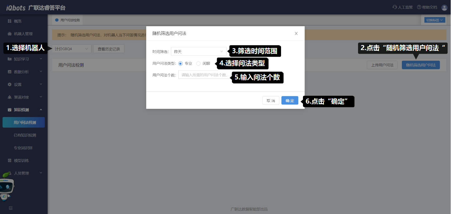 操作步骤:(1)选择机器人;(2)点击“随机筛选用户问法”;(3)在弹窗页面中设置筛选条件(时间范围、用户问法类型和用户问法个数),筛选用户问法;(4)点击筛选出的用户问法文件后的“开始匹配”,即可开始对用户问法进行检测。