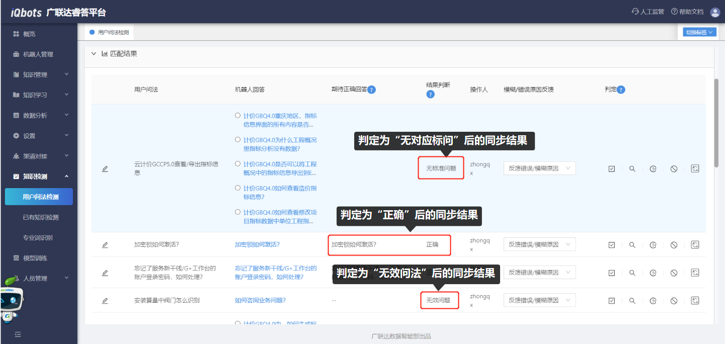 对用户问法的匹配结果进行判定:用户问法检测后,点击“匹配结果”,查看用户问法的检测结果列表;在每条问题后都可以去判定机器人回答的结果是否正确。判定类型包括:正确、正确标问、无对应标问、无效问法和模糊问法;模糊问法包括直推正确、直推错误、引导正确、引导错误四种可选的问答结果,根据机器人回复的实际情况去选择结果。