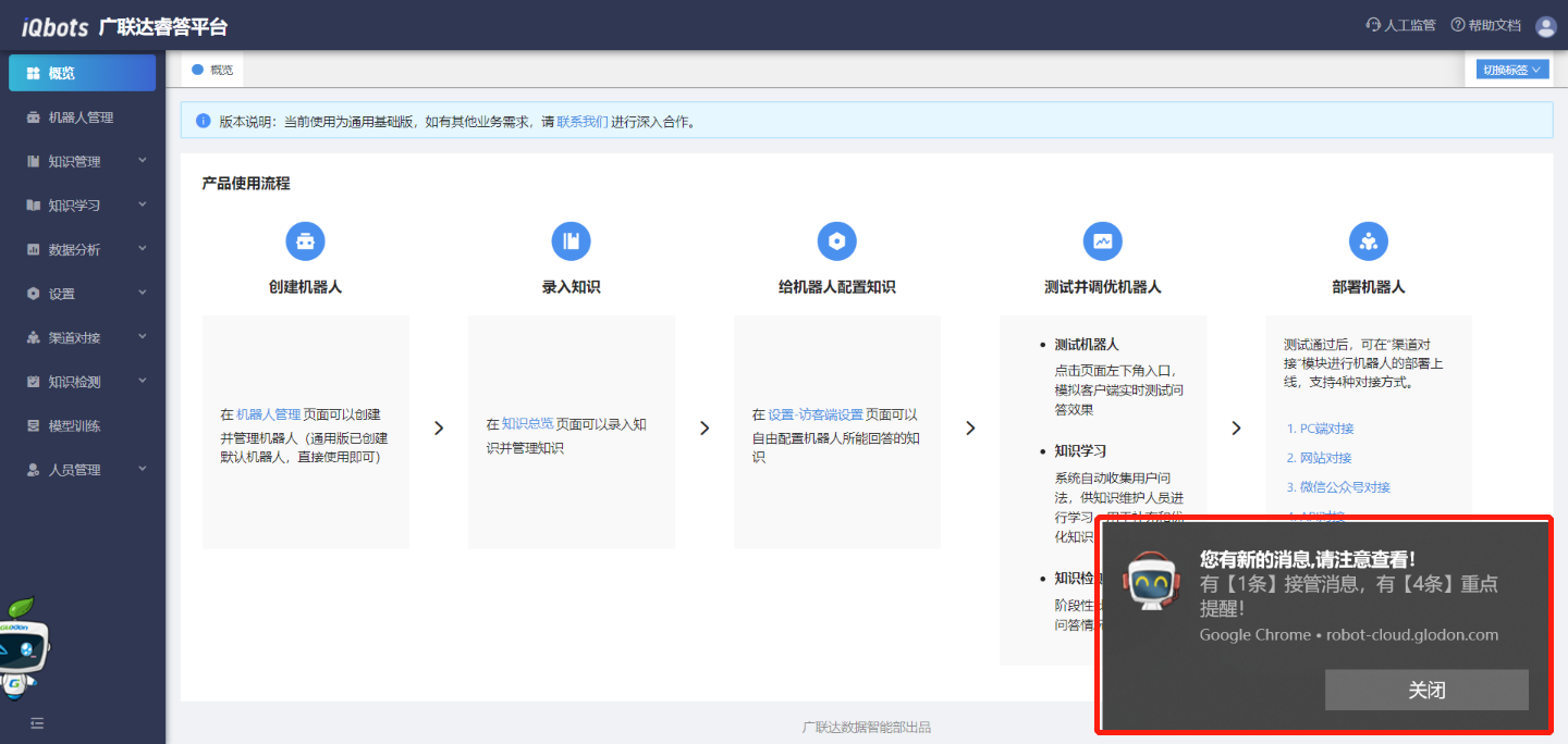 (3)当管理员打开人工监管页面,但并未停留在该页面时,若用户触发了“警示规则”/接管中用户有了新消息,则浏览器会在右下角会主动推送“重点消息”提醒通知。点击提醒通知,直接跳转到监管页面。(注意:要提前把浏览器消息通知功能打开,才能够收到消息提醒通知)