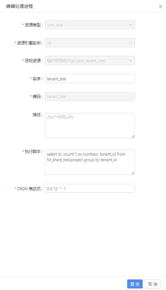 | 目标资源代码 | 只能是小写英文字母或者数字或者下划线,第一位必须是字母,最少2位,最多64位,例如 user_account |