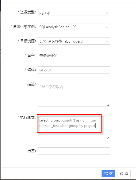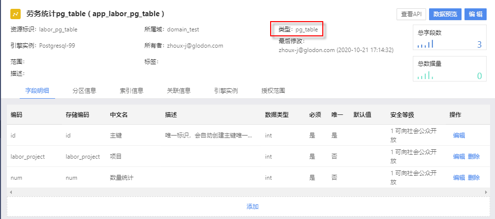 ③根据②中选择的数据资源,显示对应数据资源信息,包括数据资源名称、资源标识、所属域、类型、引擎实例、所有者、最后修改用户名称、最后修改时间、范围和标签信息,以及数据资源的总数据量和总字数段。