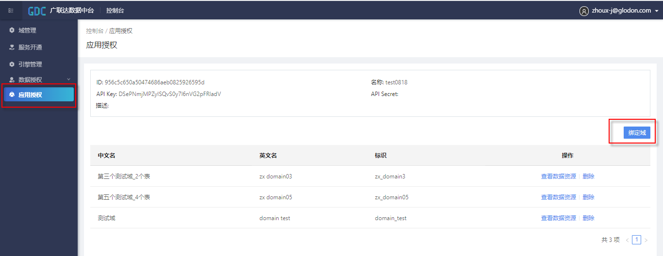 将当前用户的应用信息(AECORE)与拥有权限的域进行绑定,便于之后通过应用对域内的资源进行调用。选中某个应用,点击进入详情页后,添加绑定的域。绑定成功后,用户就可以使用在AECORE中获取的token对域内的资源进行查询、编辑、删除等操作,如下图所示。