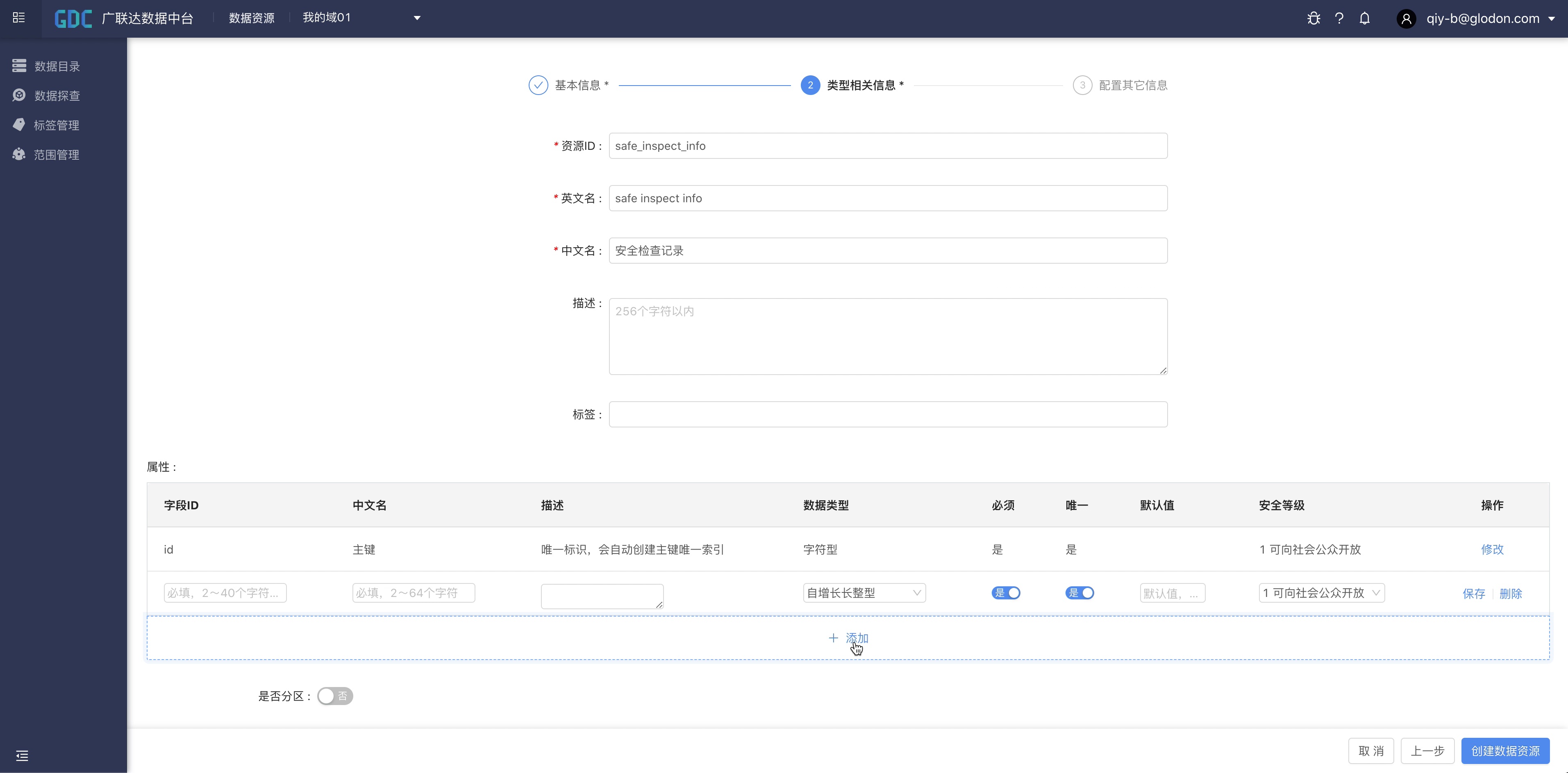 点击“创建域”按钮,输入域的编码、英文名、中文名、描述等信息,点击“下一步”