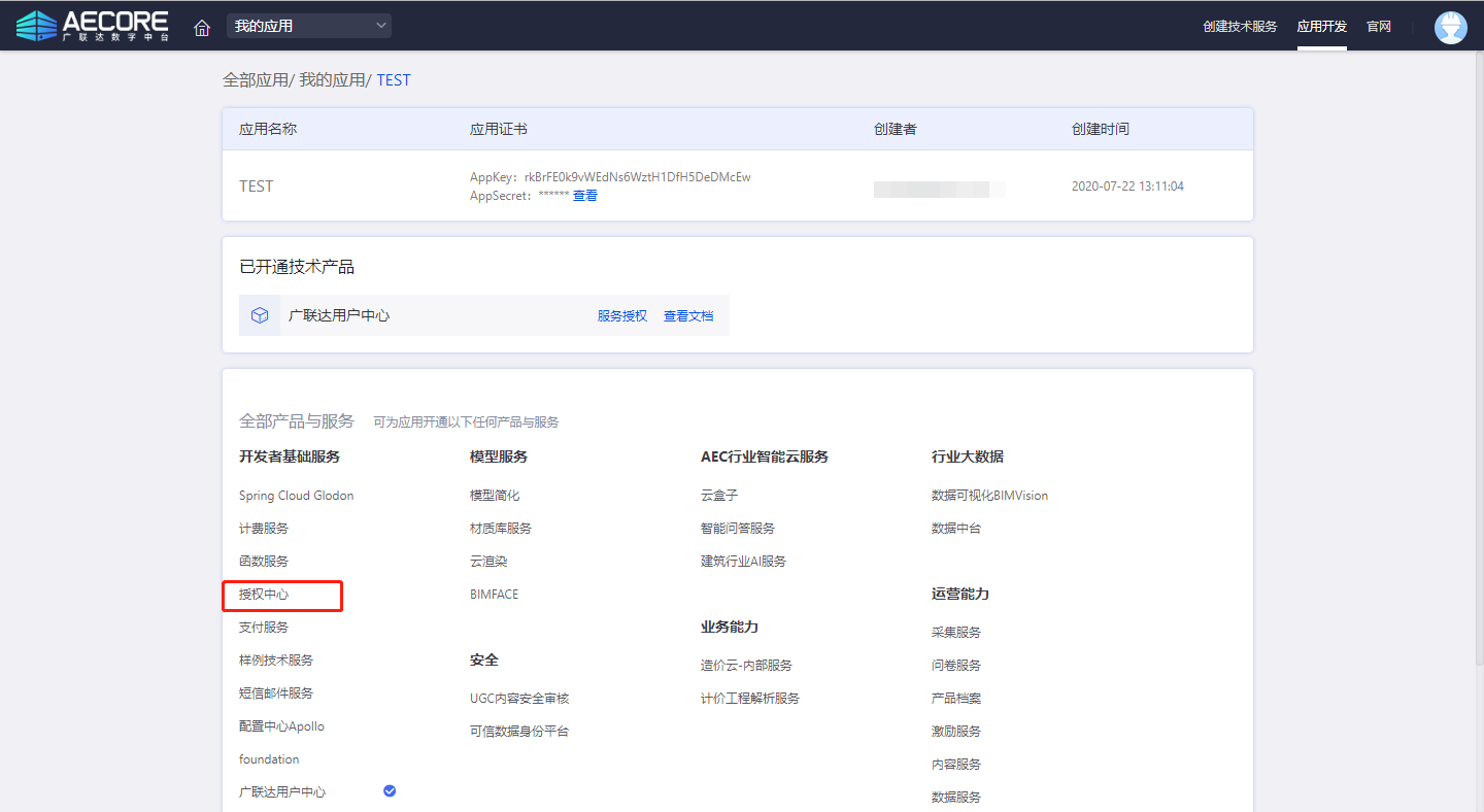 登录AECORE,并创建应用,创建应用后即可获取appkey、appsecret,这是调用服务的秘钥请妥善管理。