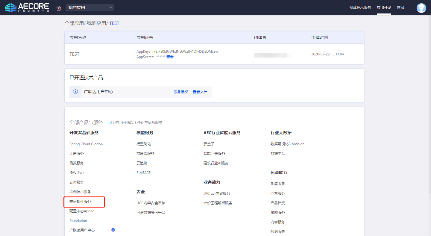 登录AECORE,并创建应用,创建应用后即可获取appkey、appsecret,这是调用服务的秘钥请妥善管理。