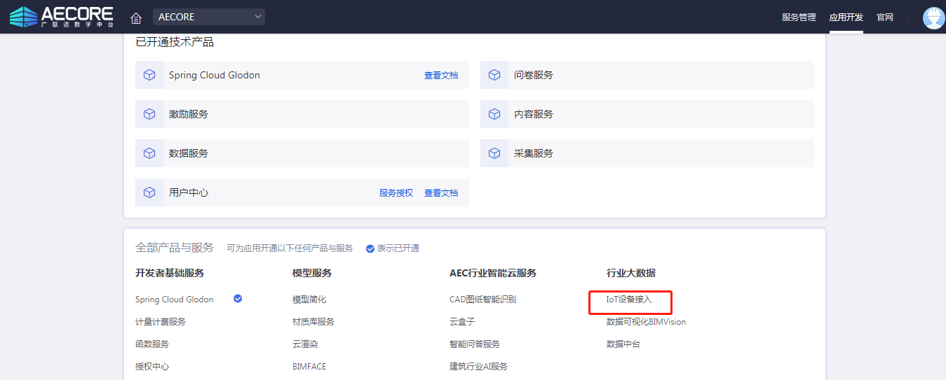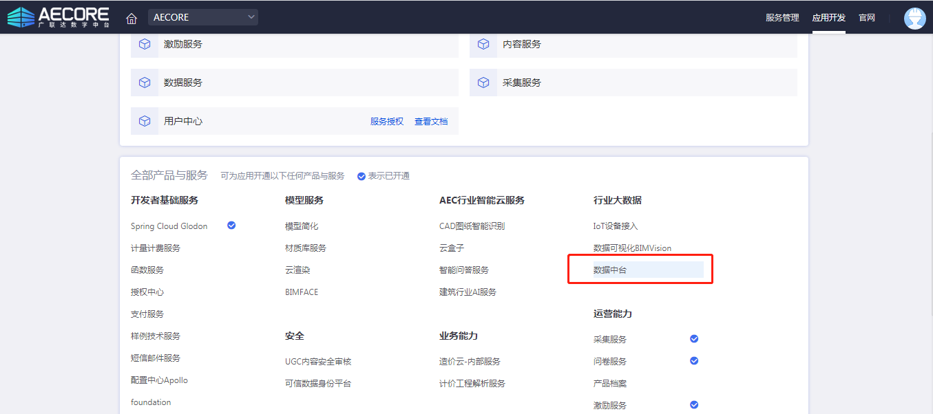 step1:登录AECORE,创建应用,开通8868体育官网登录入口数据中台服务;