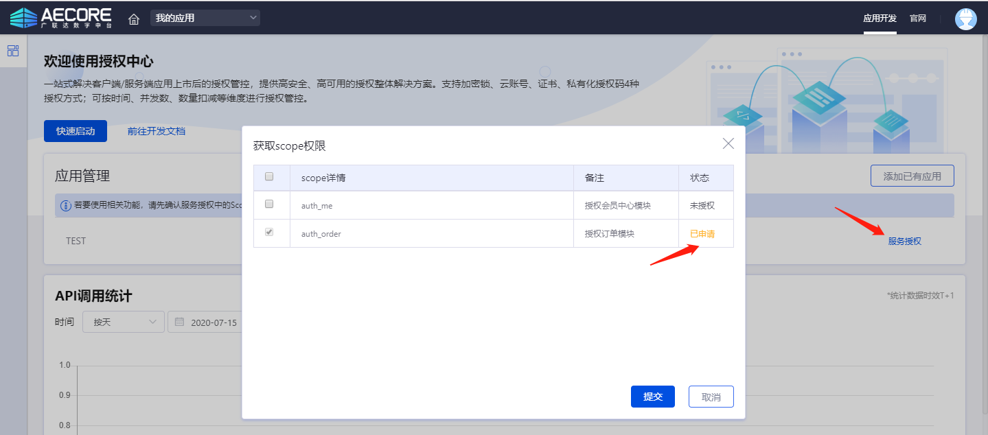 登录AECORE,并创建应用,创建应用后即可获取appkey、appsecret,这是调用服务的秘钥请妥善管理。