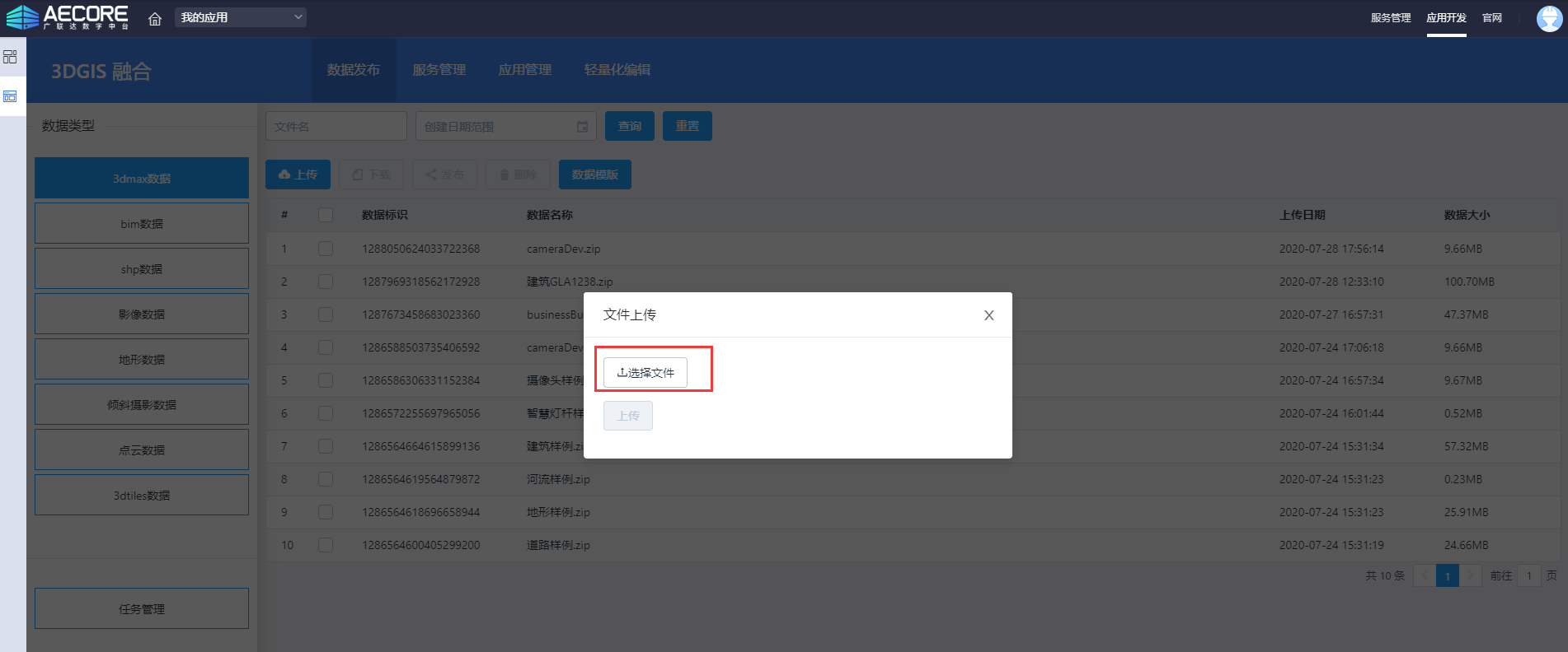 在数据列表中选择要进行发布的3dmax数据,此时,列表上方的操作【上传】、【下载】、【发布】、【删除】均可以进行操作,如下图: