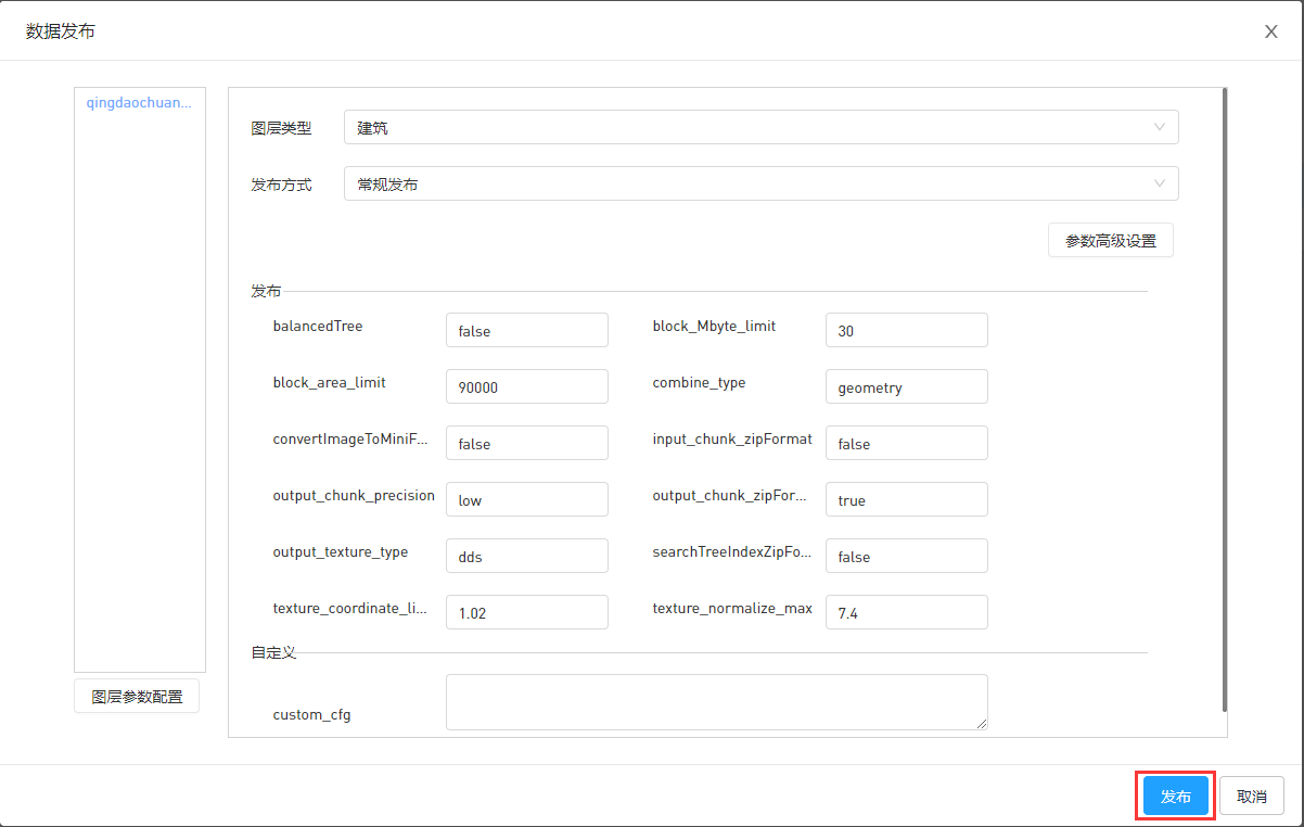 选择【图层类型】和【发布方式】,系统将3dmax的数据类型和常见发布方式进行了组合,默认给出了各组合的最优建议参数,用户可以无需修改任何参数,直接发布即可。