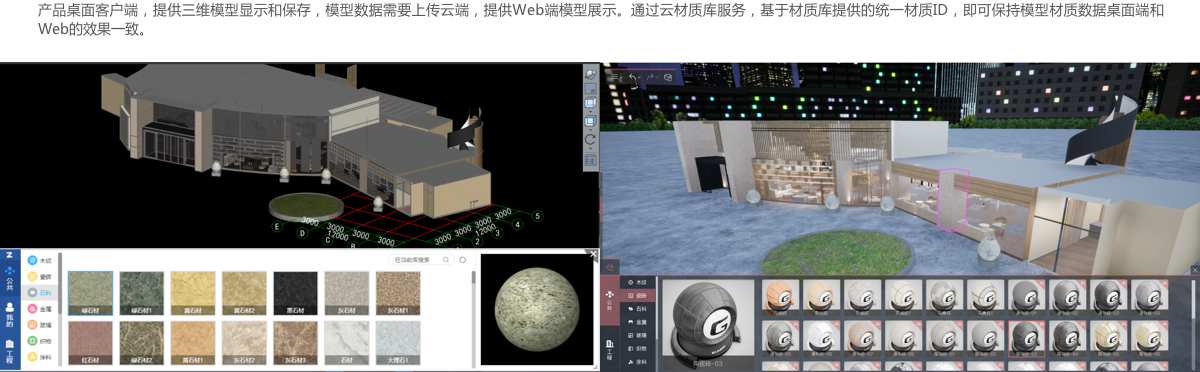 按不同的材质分类提供大量高品质材质数据供使用。系统材质库可部署云端,让终端更轻量;也可以离线部署,满足特殊无网络环境的使用要求。